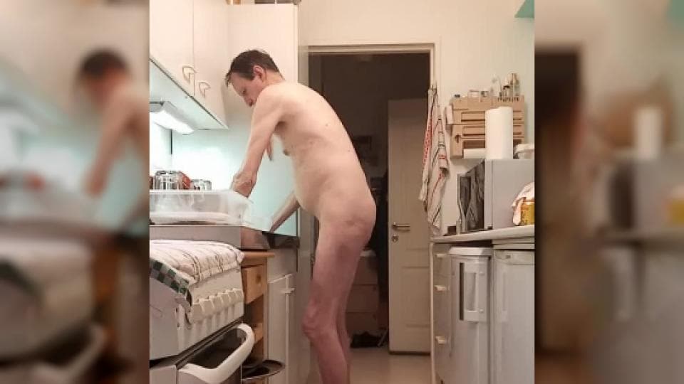 O velho é um exibicionista e se filma lavando a louça nu. Ele sempre gosta de andar por aí sem roupa!