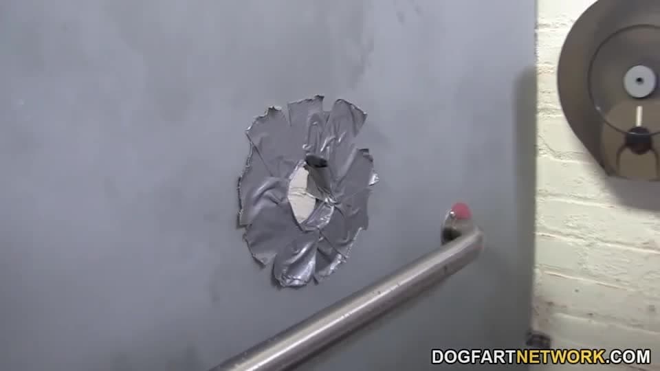 Ela vai a um banheiro público e vê um buraco na parede de onde surgirá um caralhão preto. Ela não perde tempo e começa a chupá-lo enquanto se masturba!