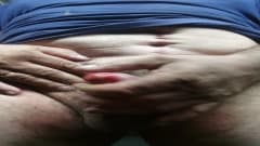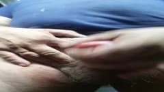 Homem gordo batendo punheta na frente
