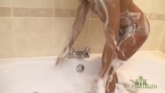 Uma linda negra se diverte em seu banho solo, entre carícias e dedadas em sua buceta, isso será um prazer para os olhos!