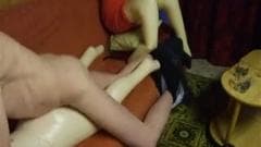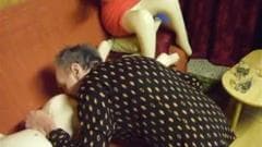 Este velho tem um par de bonecas sexuais que o excitam e ele faz sexo toda vez que ele quer foder. Ele vai foder um no sofá.
