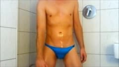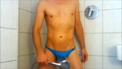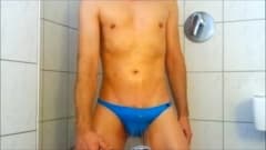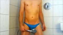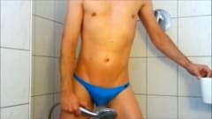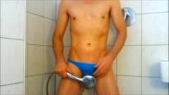 Este gay fica debaixo do chuveiro de cueca, mas você pode dizer que ele tem uma boa ereção. O que ele quer é nos mostrar seu corpo magro