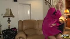 Essa mulher quer foder o entregador de pizza e ela está tão excitada por ele que o fode através de uma pizza