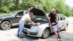 Enquanto eu estava dando uma volta, esse homem viu um amigo que tem o carro avariado, e saiu para ajudá-lo a consertá-lo e depois lhe paga com sexo.