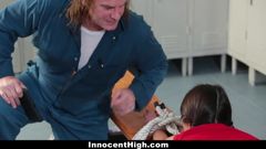 Esta bela morena terá uma aventura sexual inesquecível hoje, quando se entrega ao empregado de limpeza nos vestiários esportivos.