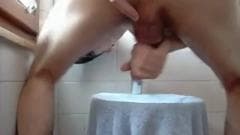 Um garoto de óculos escuros se masturba na frente da câmera e na pia, que colocou uma toalha para não esfriar na bunda,