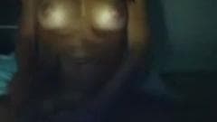 Uma linda garota com belos seios acaricia e se masturba sensualmente em frente à webcam enquanto experimenta vários biquínis.