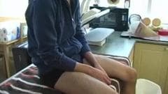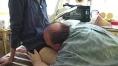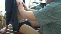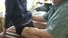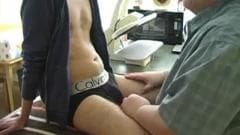 Este homem maduro, gordo e de óculos, tem um garoto sentado à mesa e acaricia-o com desejo até que ele retire seu pau e sugue
