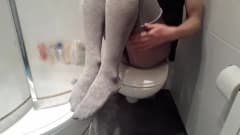 Esse cara gay adora usar meia-calça para se masturbar com elas e faz isso até gozar em si mesmo. Ele se masturba no banheiro!