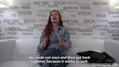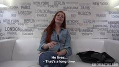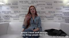 Essa linda ruiva se lubrifica e se dedilha no sofá durante esse casting pornô, que dá muito certo pra ela.