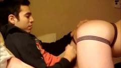 Este casal gay se diverte muito. Um coloca a bunda no outro na cara para que ele enfie a língua profundamente e o excite muito até que ele chegue