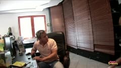 O loiro bonitão, quer que a funcionária morena sexy o subjuga e o obriga a comer sua buceta. Não perca!
