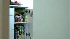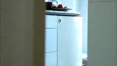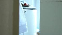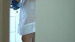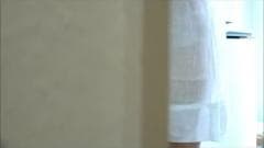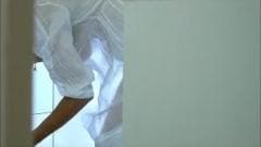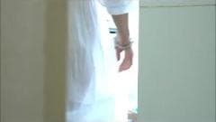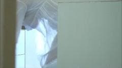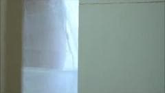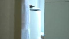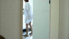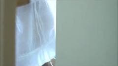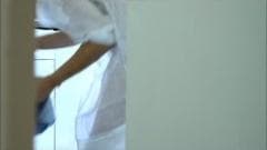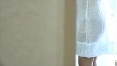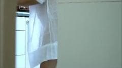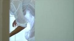 Esse cara vê que a porta está meio aberta e decide gravar essa mulher vestindo um vestido quase translúcido que revela seu contorno nu.
