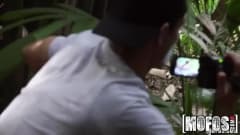 Uma jovem morena e um homem estão ambos na natureza. Ela vai aproveitar para se masturbar e quando ele aparece, ela paga um boquete.