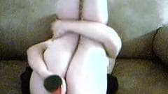 Ela usa seus brinquedos para penetrar em sua buceta quando está sozinha em casa e sentada no sofá em frente ao computador.