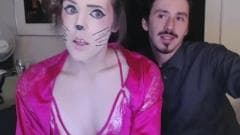 Esta transexual se disfarça de gatinha para ter esse encontro sexual com um homem na frente da câmera enquanto a visita em casa.