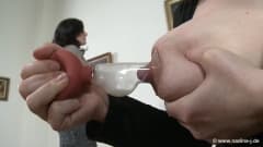 Uma garota começa a brincar com seus peitos grandes e eles estão preenchidos com leite, uma outra gata entra e suga o leite dos peitos grandes.