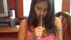 Vemos que essa jovem morena vai ficar muito excitada com esse homem que se aproveita dela e a coloca para chupar o pau duro na frente da câmera