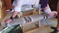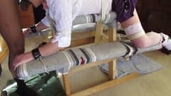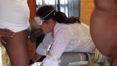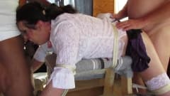 De olhos vendados e amarrada a um banco, essa trani é fodida por dois tios pervertidos que não têm piedade e a dominam forte e saborosa.