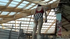 Esta linda mulher despe-se na piscina pública fria para nos mostrar seus seios naturais e seu belo corpo em forma. Aproveite!