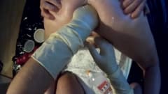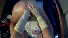 Esse cara levanta a bunda e abre completamente para que seu amigo coloque a mão na íntegra com a ajuda de cremes e luvas cirúrgicas.