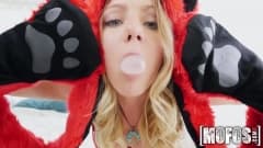 Loira gostosa com gorro de urso chupando no POV