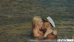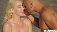 Essa linda loira peituda vai foder com um careca mega gostoso. Ela vai chupar a rola grossa dele e depois cavalga com ele deitado na areia!
