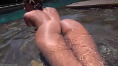 Ela está nua à beira da piscina e curtindo seu corpo sob o sol, bem aberta e com muito tesão