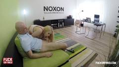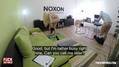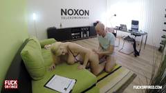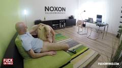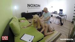 Uma loira com peitos grandes recebe um creampie anal em seu casting pornô. O cara ousado vai transar com ela no sofá verde.