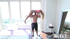 Esta linda loira está tendo uma aula de ginástica em seu quarto. Enquanto faz os exercícios, ela decide tirar o pau do professor para chupá-lo e se diverte