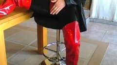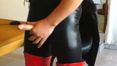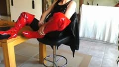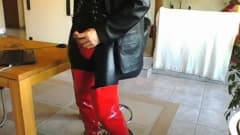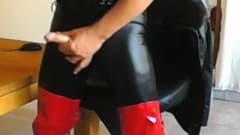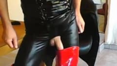 Um homem vestido com roupas pretas de látex e longas botas vermelhas masturba seu grande poste na frente da câmera.