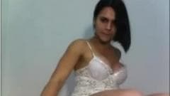 Elae está de frente para a câmera e começa a tirar a roupa de baixo. Seus seios grandes aparecem e, surpresa, seu grande pau aparece também.