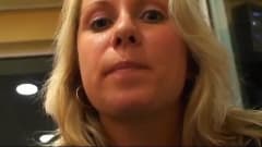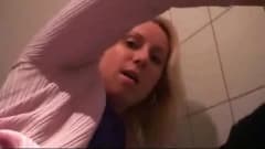 Essa mulher bonita foi comer um hambúrguer e entrou no banheiro público para foder um estranho que a pega se masturbando.