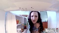 Uma morena bem safada bate uma sirirca gostosa e vê que uma câmera está a filmá-la. O cara da câmera chega e convence a dar uma chupada e foder com ele!
