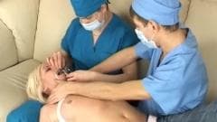 Esses dois caras fazem o papel de médicos para adormecer com anestesia esta linda loira e depois fazer sexo como bem entenderem.
