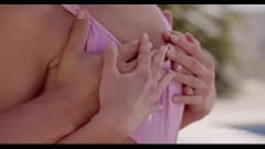 São férias e este casal decidiu aproveitar ao máximo seu tempo à beira da piscina e esta garota loira, que não tem muitos peitos.