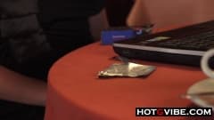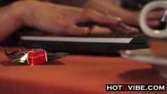 Essa moça elegante veio trabalhar na tranquilidade dessa cafeteria. Ela está muito distraída e acaba se acariciando com um dedo chinês