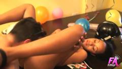 Esta festa acabou e há apenas uma negra no chão ao lado de balões. Ela fica nua e seu macho transa com ela para aproveitar o momento.