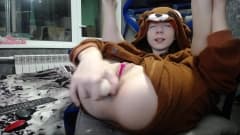 Esta jovem veste uma fantasia de cachorrinho e com as pernas abertas se masturba intensamente. Ele coloca um no cuzinho com outro na buceta
