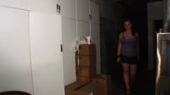 Um de seus funcionários a pega se masturbando em um armazém e agora ela não poderá se recusar a trepar com ele por muito tempo. Que tetas lindas