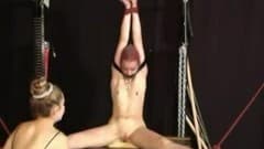 Hoje essa ruiva depravada vai ter uma sessão de sexo extremo e bondage, enquanto outra garota vai se divertir fazendo cócegas em sua vagina.