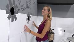 Uma mulher jovem, gostosa e loira está prestes a ser fodida por um homem que só enfia o pênis em um buraco