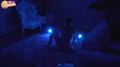 Uma mulher morena está prestes a se tocar com um brinquedo sexual quando dois homens vestidos de preto entram na casa porque querem transar com ela.