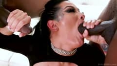 Interracial espetacular com dois caras de pau grande e duro e uma gostosona com coxas lindas, uma grande bunda melada de óleo e bucetinha molhada.