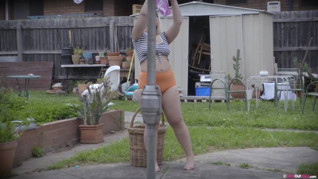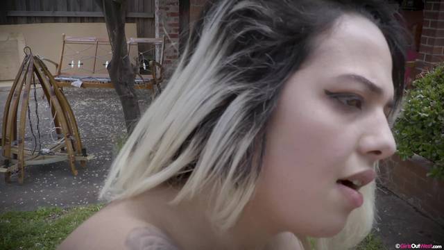 Essa linda loira sai com sua pequena cesta nas mãos para se tocar sozinha e ao ar livre.