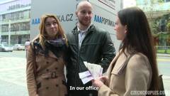 Uma garota oferece dinheiro a um casal para fazer sexo em grupo nas escadas de um prédio, e eles não pensam duas vezes.