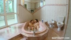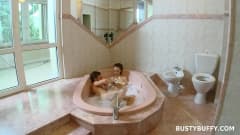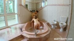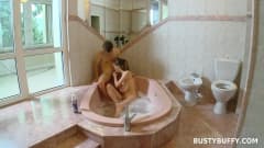 Entre o boquete e a penetração, ele transa com sua namorada de seios grandes na banheira. Coisas deliciosas acontecem na água.