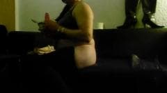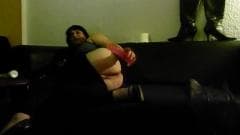 Esse homem transexual está relaxando em casa num momento de prazer solo. Depois de enfiar um bom dildo em sua bunda gorda, ele se senta para bater punheta!
