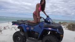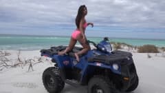 Uma jovem árabe, uma vagabunda bem torneada, chegou à praia de quadriciclo e mostra com entusiasmo seu corpo sexy e depois masturba sua boceta peludo.