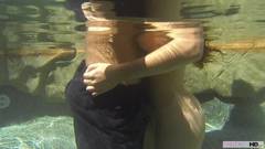 Uma bela jovem de lingerie vermelha com a buceta peluda fica presa na piscina por um longo tempo.